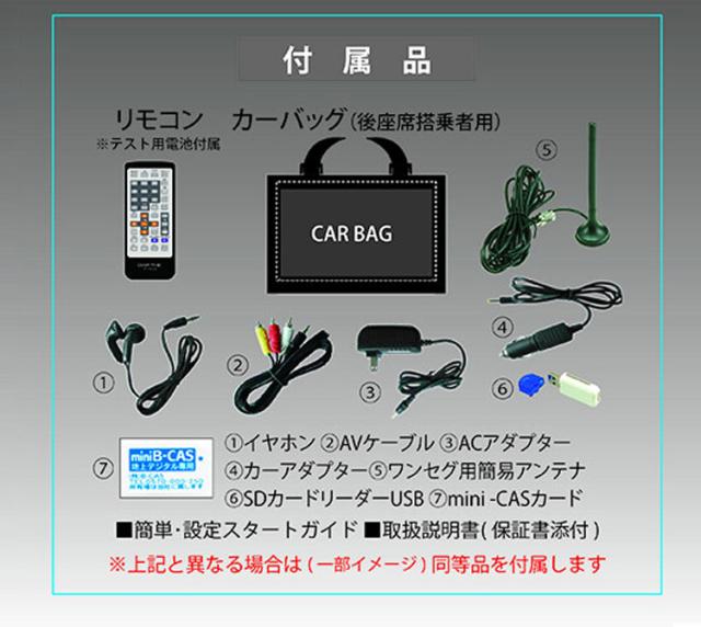 リモコン※テスト用電池付属、カーバッグ(後座席搭乗者用)、イヤホン、AVケーブル、ACアダプター、カーアダプター、ワンセグ用簡易アンテナ、SDカードリーダーUSB、mini-CASカード