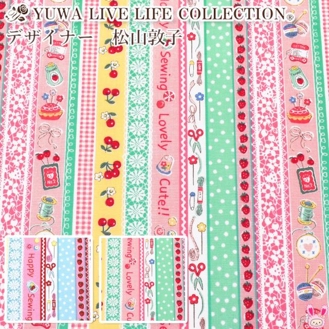 松山敦子さんがデザインした愛らしいシャーティング素材の生地です。ソーイング小物やフルーツなどがストライプ状に描かれた可愛いファブリックです。さりげないレース柄や水玉柄が全体的にガーリーでキュートな印象を与えます。ファッションや小物に可愛らしさを加えたい方におすすめです。