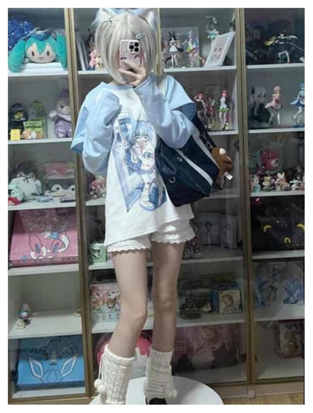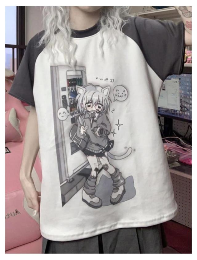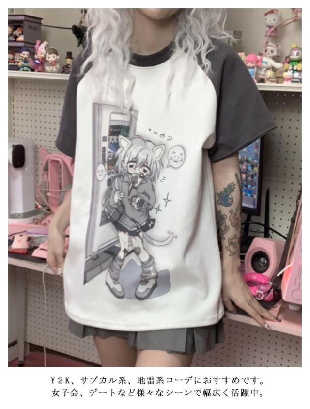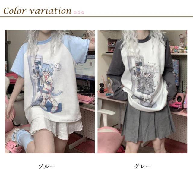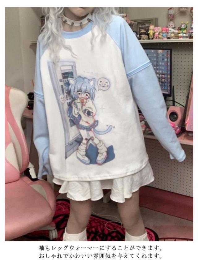 Tシャツ レディース 袖取り外す可能 トレーナー スウェット 夏 秋 春病みかわいい 半袖 長袖 トップス 学生 サブカル系 地雷系 量産型 原宿系 天使界隈 ストリート系 おしゃれ 服 ロゴTシャツ アニメ プリント ブルー ティーシャツ レイヤード