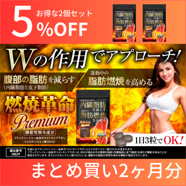 ・燃焼革命Premiumは、腹部の脂肪(内臓脂肪・皮下脂肪)と脂肪燃焼に特化した機能性表示食品になります。従来品から「HCA」や「ポリメトキシフラボン」を配合しWの作用でサポート!シリーズ最高峰の商品となっております。