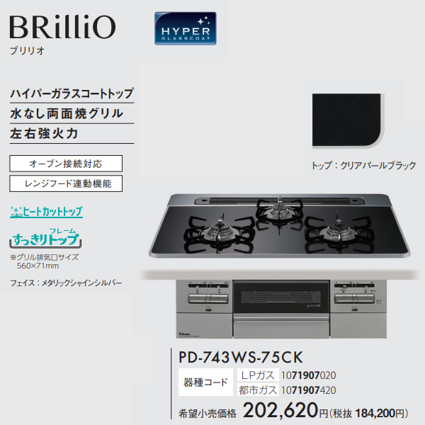 ビルトインコンロ Paloma パロマ BRilliO ブリリオ PD-743WS-75CK LP プロパンガス クリアパールブラック 幅75cm