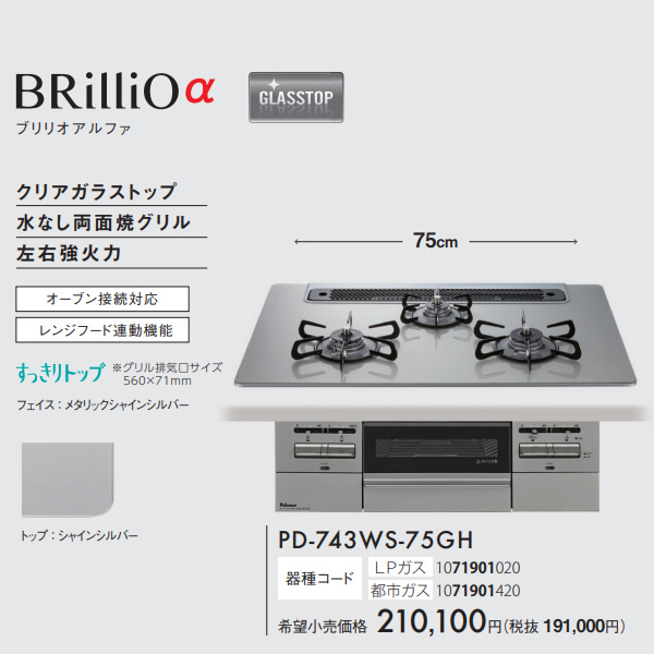 ビルトインコンロ Paloma パロマ BRilliO α ブリリオアルファ PD-743WS-75GH 12A13A 都市ガス シャインシルバー 幅75cm