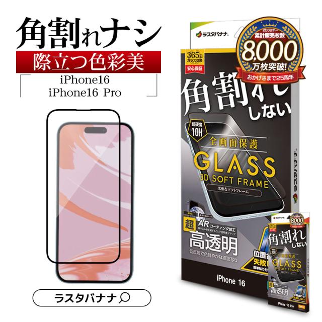 iPhone16 16 Pro iPhone15 ガラスフィルム 全面保護 高光沢 ARコーティング 角割れしない 0.25mm 硬度10H ガイド枠付き ラスタバナナ