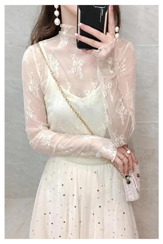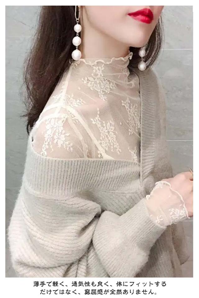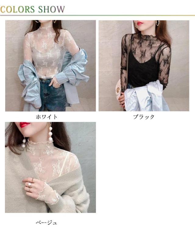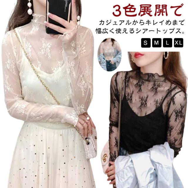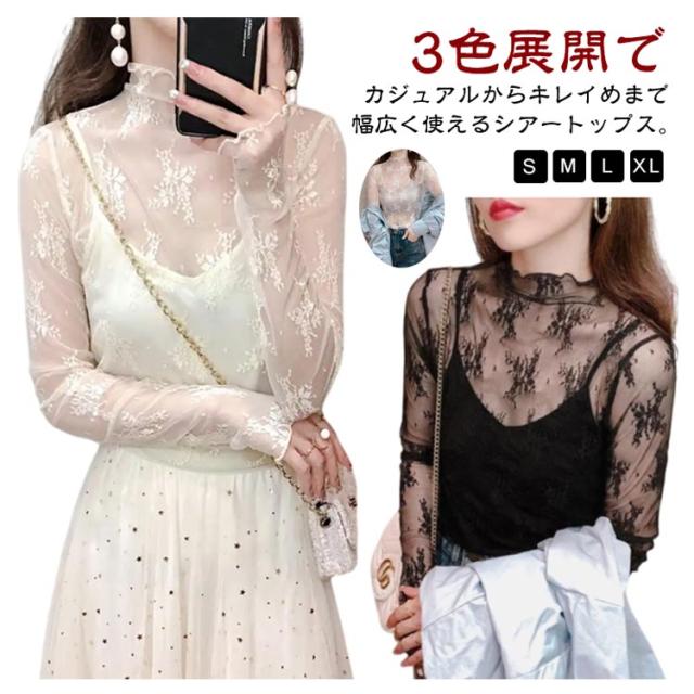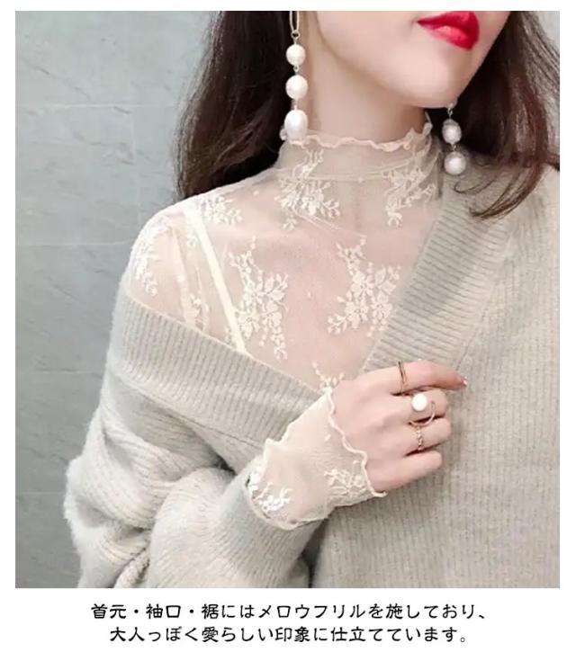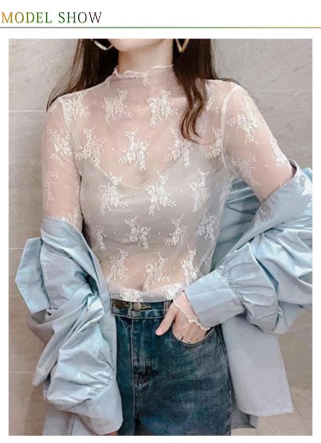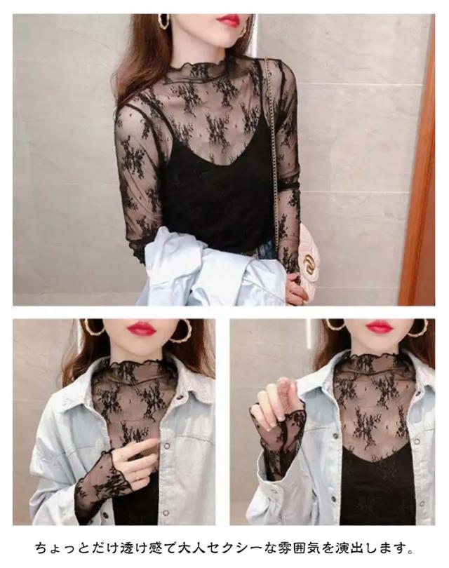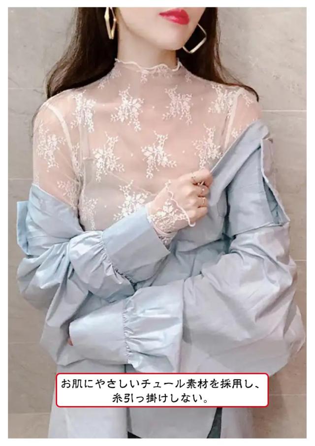 花柄レース ハイネック 可愛い 重ね着 チュール シアーシャツ トップス シアートップス 肌見せ お洒落 伸縮性 透け感 長袖 柔らかい 薄手 花柄 シースルー 春夏秋冬 レイヤード風 レディース