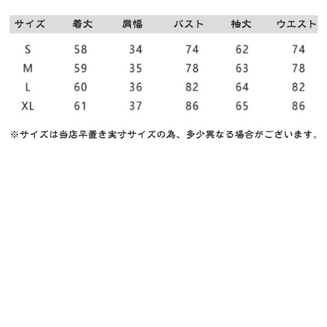 | サイズについての説明 | サイズ 着丈 肩幅 バスト 袖丈 ウエスト ※サイズは当店平置き実寸サイズの為、多少異なる場合がございます。 |