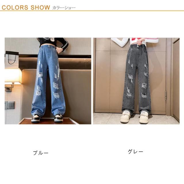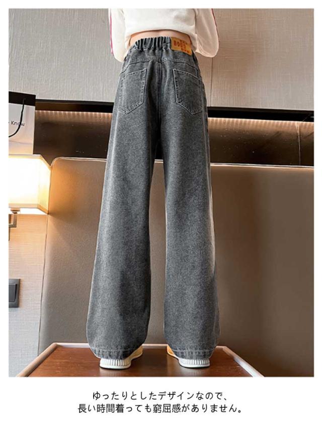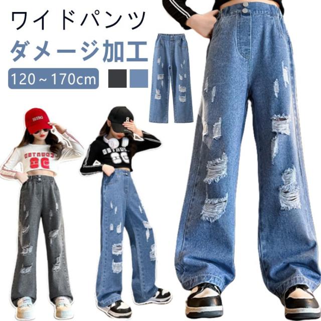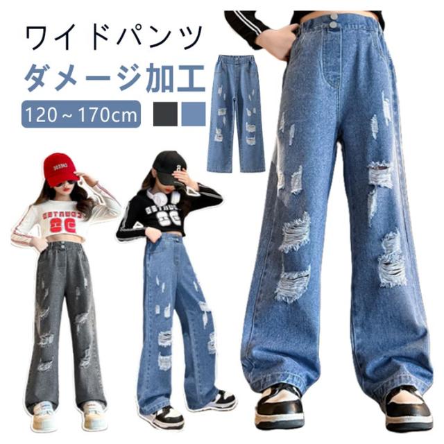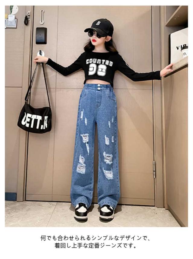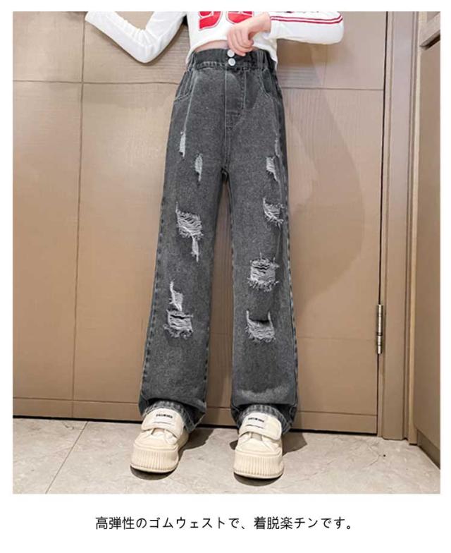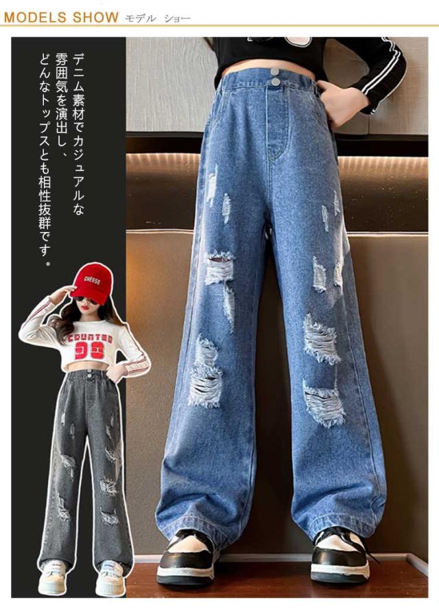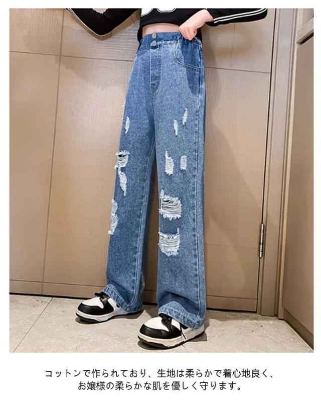 Jeans 140 160 ダンス 150 130 ワイドパンツ 子供 ジーンズ 120 ジーパン 女の子 デニム 170 キッズ キッズ ストレート 服 フレアパンツ 衣装 ウエストゴム ダメージ加工 ロングパンツ 小学生 中学生 秋服 春服 子ども こども服 ワイド パンツ おでかけ 流行