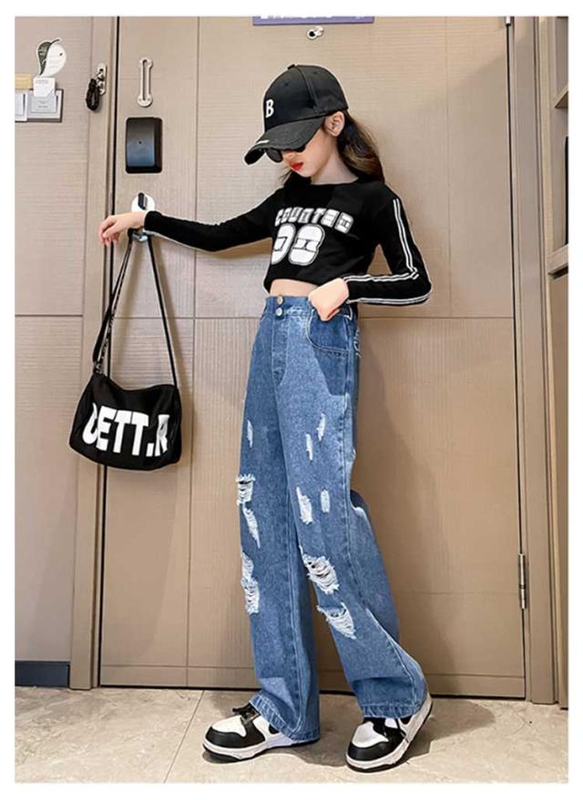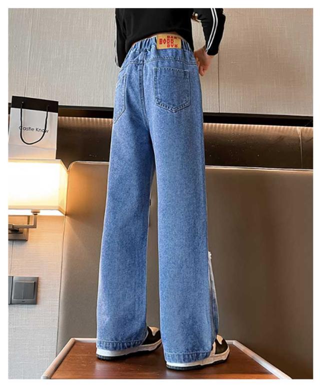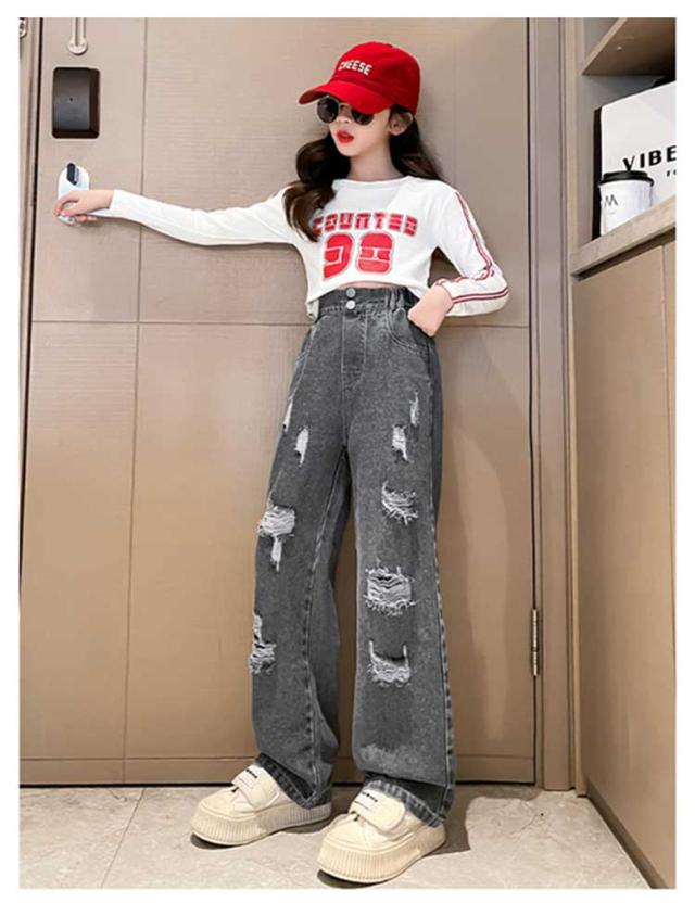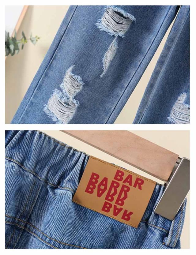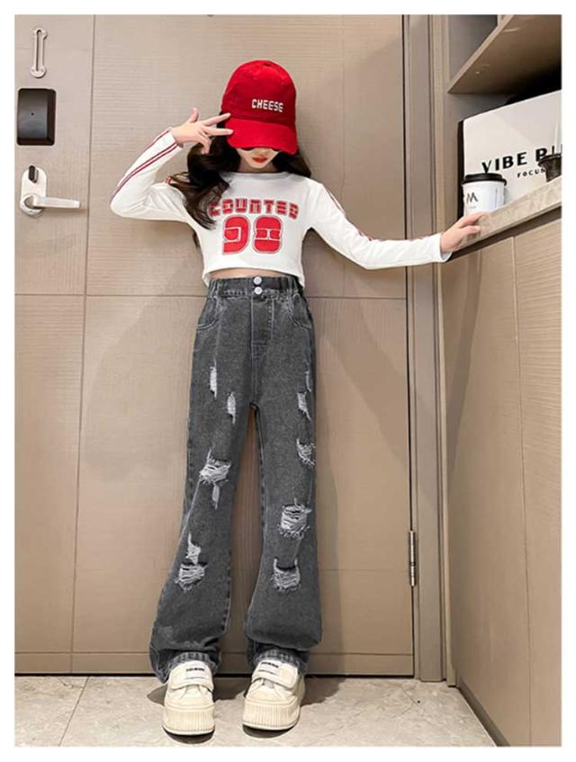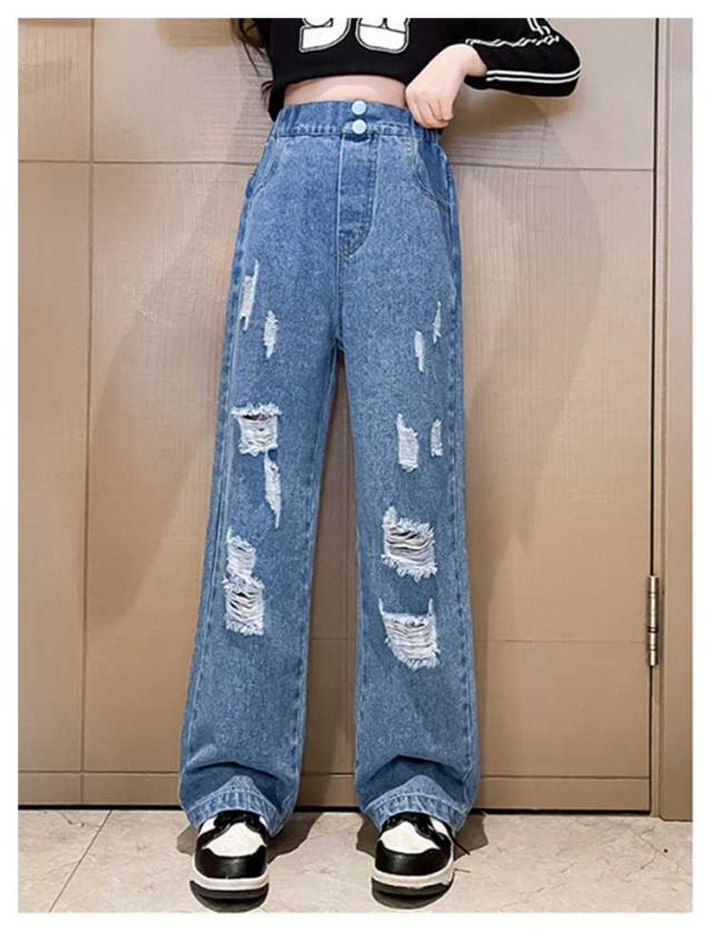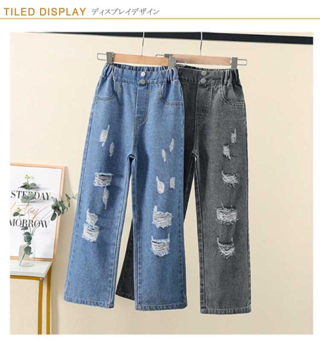 Jeans 140 160 ダンス 150 130 ワイドパンツ 子供 ジーンズ 120 ジーパン 女の子 デニム 170 キッズ キッズ ストレート 服 フレアパンツ 衣装 ウエストゴム ダメージ加工 ロングパンツ 小学生 中学生 秋服 春服 子ども こども服 ワイド パンツ おでかけ 流行