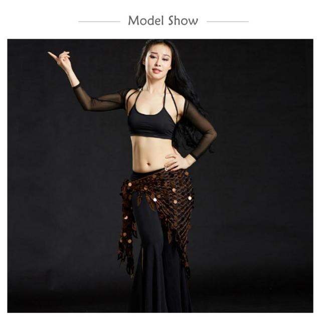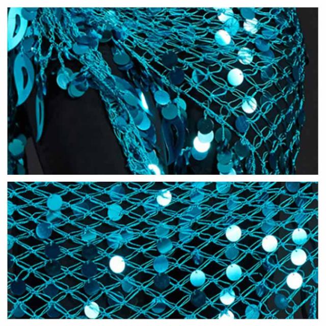 | 透け感のある生地にコイン風・フリンジ・飾りがついた豪華なヒップスカーフ。 揺れるたびにキラキラ輝きます♪ キラキラした飾りとフリンジでステージ映え◎ | |