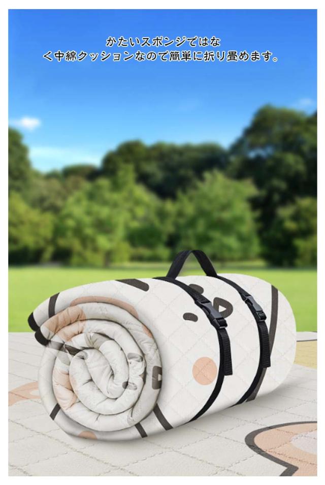 | 【軽量コンパクト】かたいスポンジではなく中綿クッションなので簡単に折り畳めます。 【5層構造】地面と接する裏面にアルミフィルムを使用しているため「防水性・断熱性・耐久性」に優れ、地面からの湿気や冷気をシャットアウトします。また、海水浴や川遊びで使う時に砂がくっつかずサラっと弾き返します。 真ん中に中綿が詰まっているため軽度のクッション性があります。 表面はポリエステルのサラサラとした素材です。撥水加工を施しているため水分を弾いたり砂や草がくっつきにくいです。 【使用シーン】ピクニック、花見、花火大会、運動会などのレジャーや学校行事で活躍します。また、キャンプのテントインナーシートとして敷けば、アルミの断熱効果により冬の底冷え対策もできます。他にも、アウトドアを楽しむ方なら車内に常備しておくとちょっとした時にさっと使えて大変便利です。 【お手入れ簡単】洗濯機でまるごと洗えますので汚れても安心です。清潔に保てるためテントのインナーとして使いやすいです。 | |