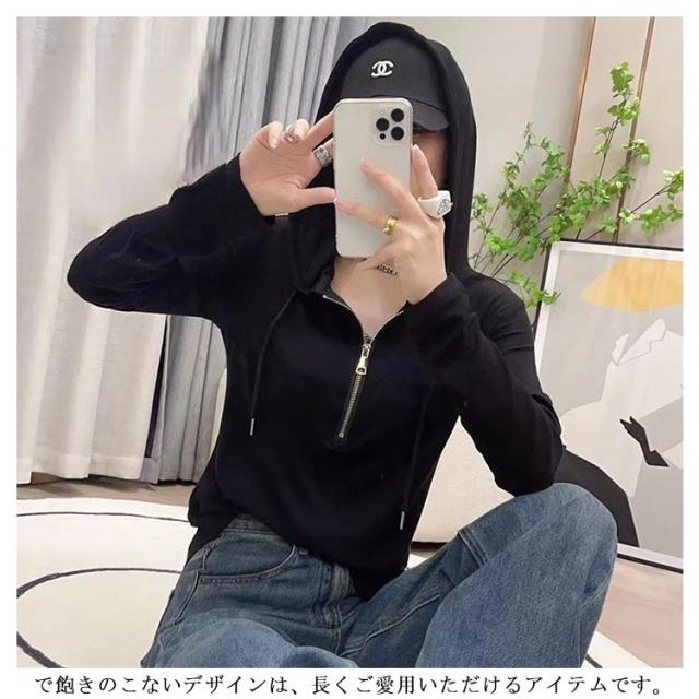 フード付きTシャツ ショート丈 ハーフジップ スウェット パーカー レディース フード付きTシャツ 長袖 長袖tシャツ フード付き ロンT カットソー プルオーバー ロングtシャツ ロンティー カジュアル 体型カバー 無地