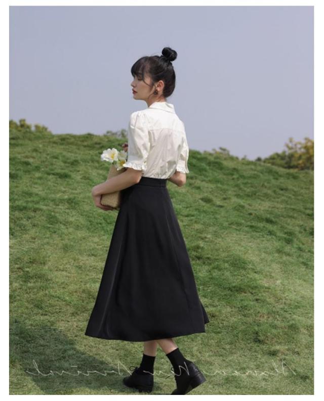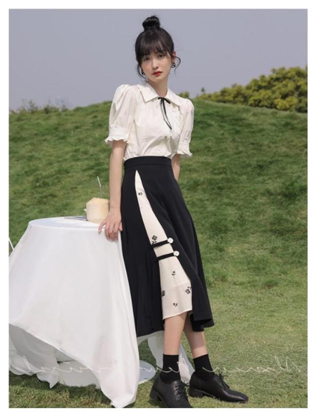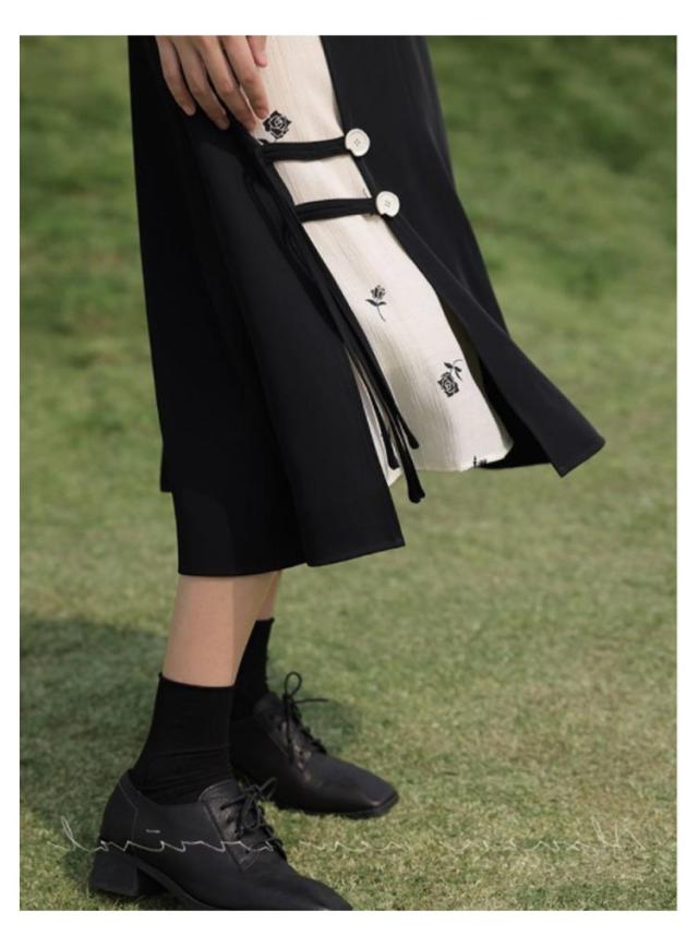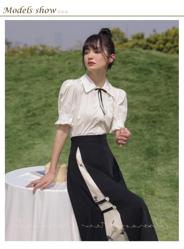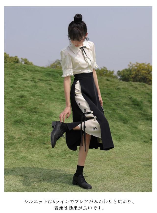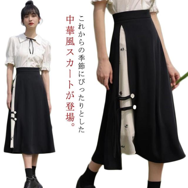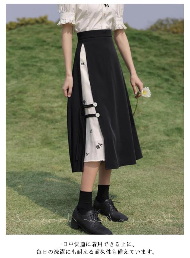 スカート チャイナ風 黒 漢服 ハイウエスト ロング丈 Aライン 切り替え 大人かわいい プリーツ ロング きれいめ ボタン おしゃれ 服 ドレス チャイナ風 花柄 大人可愛い バイカラー 春 夏