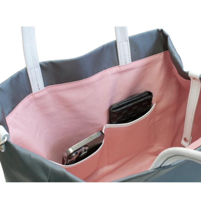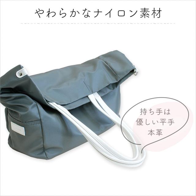 素材は柔らかな風合いが魅力の高密度ナイロン、上品な光沢と本革の持ち手が、シンプルなデザインを引き立て、高級感ある大人の洗練された日常を演出します。