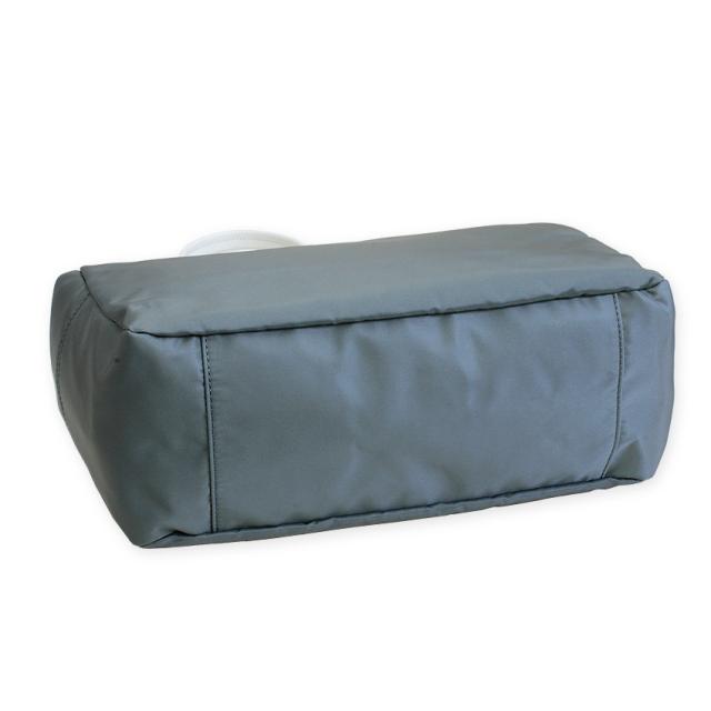 柔らかな高密度ナイロンの程よい光沢と風合い、本革の持ち手が、シンプルながらも上質な印象を与えます。