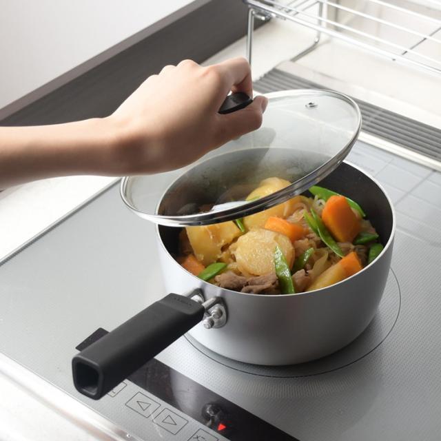 こぶりなサイズとデザインのガラス蓋付き片手鍋。