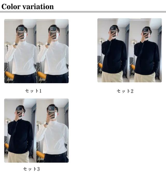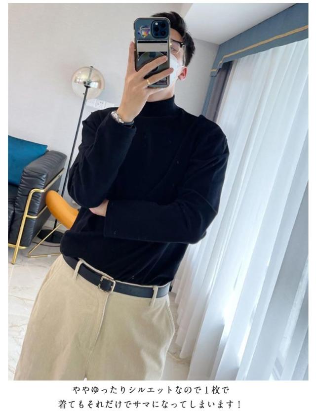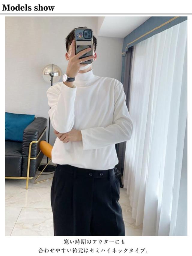 | 秋冬のコーディネートには何かと欠かせないインナーです。 寒い時期のアウターにも合わせやすい衿元はセミハイネックタイプ。 高くなりすぎない絶妙なネック幅でアウターとのコーディネートも相性バツグンです! とてもなめらかなスムース素材でできているので、肌触りも抜群! Tシャツ感覚で着られるので、シャツやジャケットのインナーにすっきりキマります。 何かとコーディネートに役立ちそうな心強い一着になりそうです! ややゆったりシルエットなので1枚で着てもそれだけでサマになってしまいます! | |