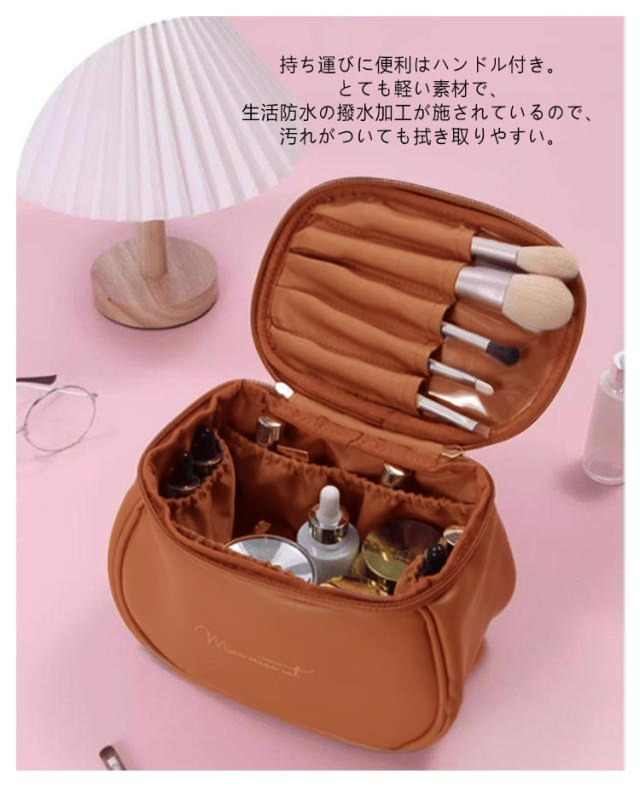 | ガバッと開いて、たっぷり収納 化粧ポーチ 大容量 普段使いのすべての化粧品(口紅、リップブロス、メイクブラシ、チーク、アイブロウ、アイシャドウなど)をきれいに収納できます。化粧道具だけではなく、小物入れとしてもおすすめです。 旅先で散らかりがちな洗面用品や化粧品類、アメニティグッズなどもまとめて収納! 内部には小物を細かく分けてキレイに収納できるポケットや、ブラシなどのスティックコスメなどの収納に便利なスペースも完備。 ダブルファスナー&フルオープンが可能なので、大きく開き、荷物もより取り出しやすいデザインに。 メインスペースにはボトルタイプのコスメなどの大きめ容器のものが収納できるたっぷり大容量デザイン。 小さな小物類の収納に便利なゴムポケットやフリーポケット付きべ、とっても便利。 持ち運びに便利はハンドル付き。 とても軽い素材で、生活防水の撥水加工が施されているので、汚れがついても拭き取りやすい。 大容量なので化粧ポーチだけでなく、旅行や普段の身の回りの収納にも。 丁寧な縫製でこだわってつくられているので丈夫なつくり。 | |