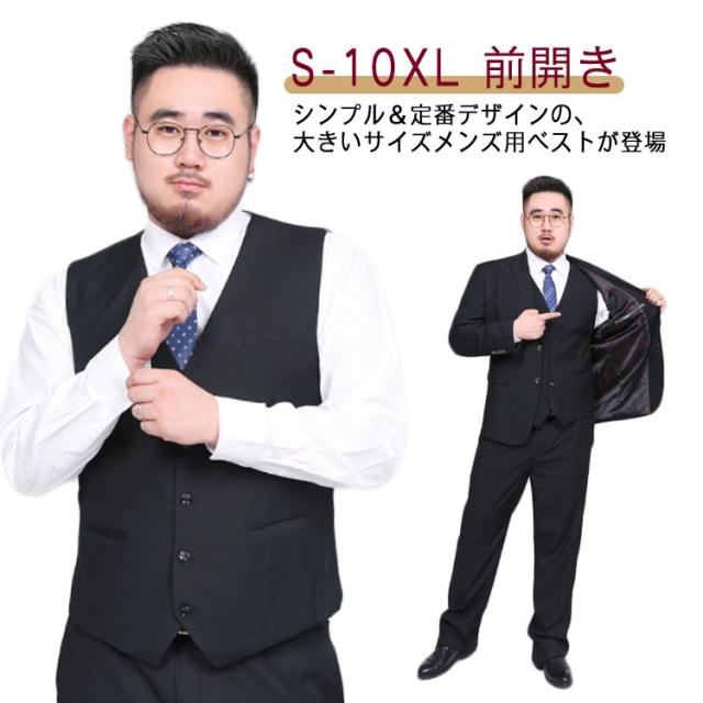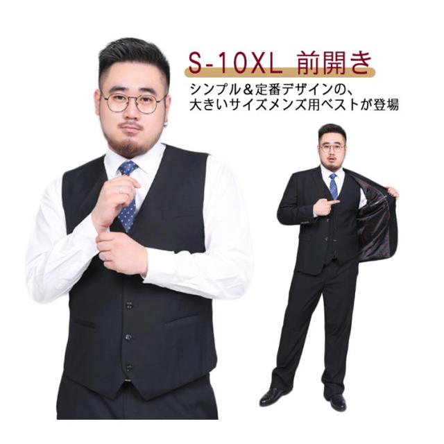 10XL! 二次会 ベスト 大きいサイズ フォーマルベスト 前開き ビジネス ブライダル 紳士 結婚式 メンズ パーティー スーツ ノーカラー 黒 ブラック