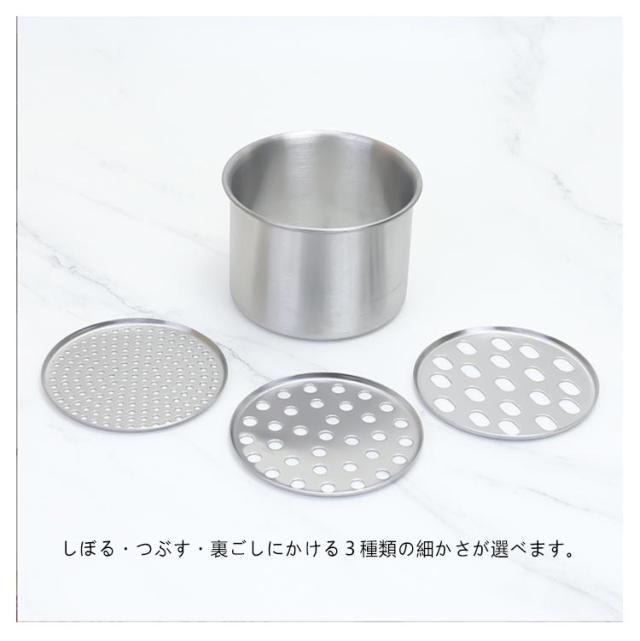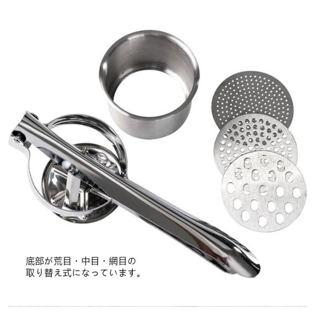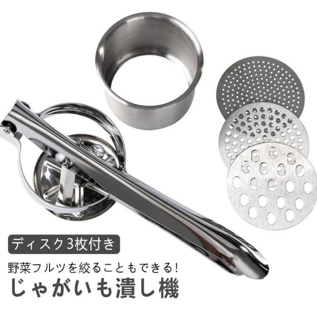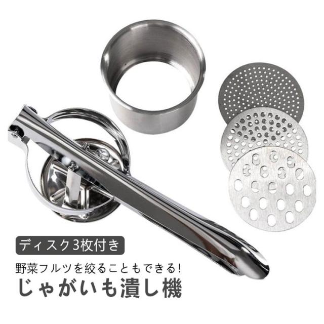 | ポテトマッシャー じゃがいも潰し機 野菜フルツを絞ることもできる! ディスク3枚付き 食感の好みや気分よって目の粗さを変えられる! ポテトサラダやコロッケ作りだけではなく、 めん作りやさいを絞ったり、ジューサーとしてもご利用いただけます。 <お勧めポイント> ●しぼる・つぶす・裏ごしにかける3種類の細かさが選べます。 ●底部が荒目・中目・網目の取り替え式になっています。 ●しぼる・つぶす・裏ごし、いろいろな材料に応じて使い勝手が良い。 ●丈夫なプラスチック製で軽く使い勝手のよい商品です。 | |