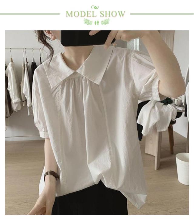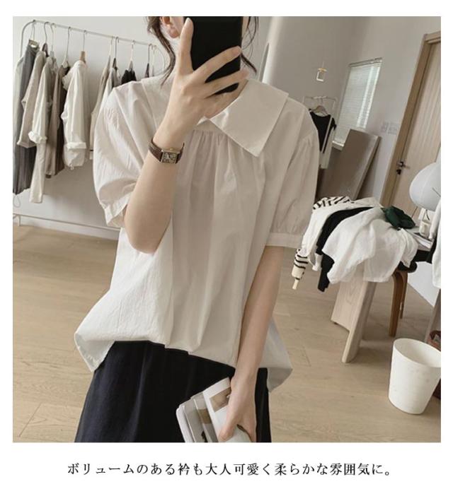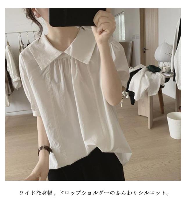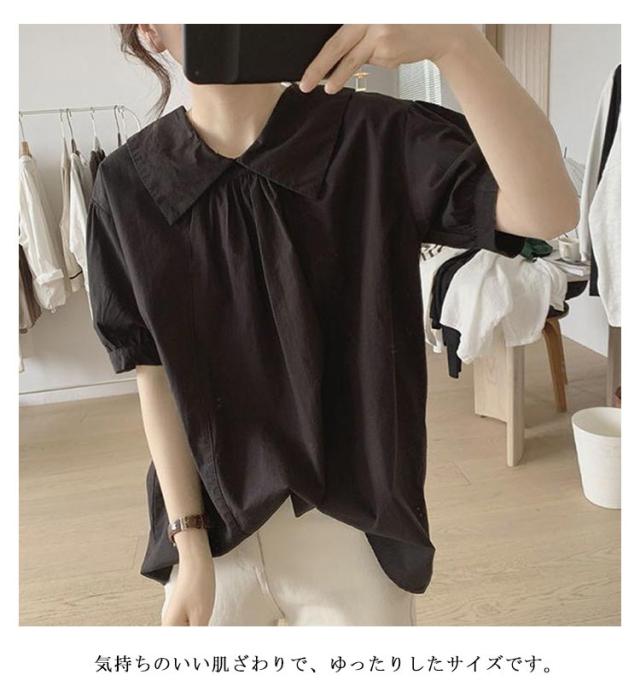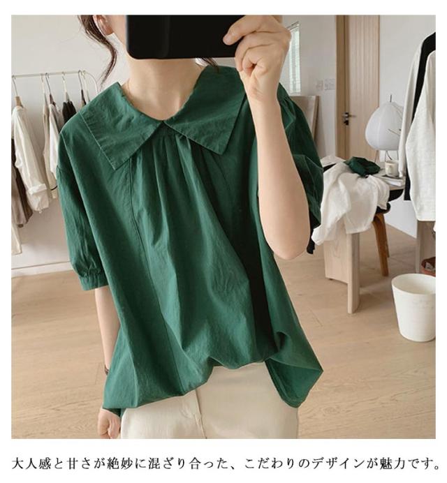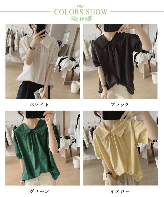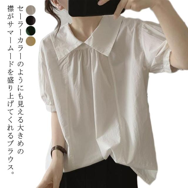 角襟 レディース シャツ ゆったり 着痩せ 半袖 春 襟付き ビッグカラー 大き目 襟 セーラー風 夏 プルオーバー ビッグカラー 体型カバー スタイルアップ おしゃれ 大人 可愛い シンプル ブラック ホワイト グリーン