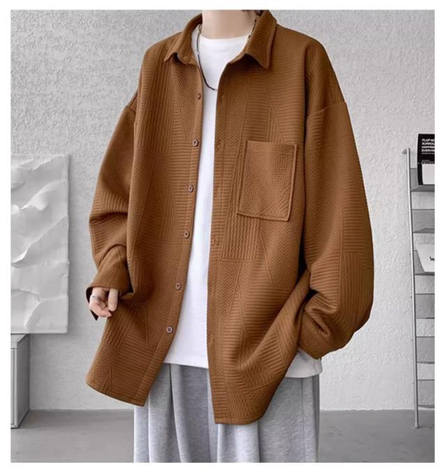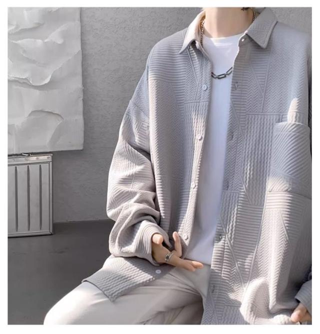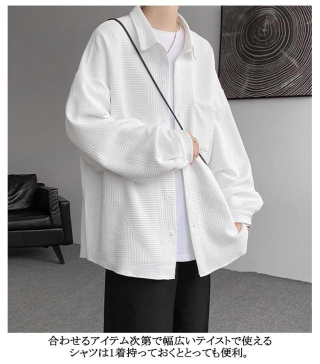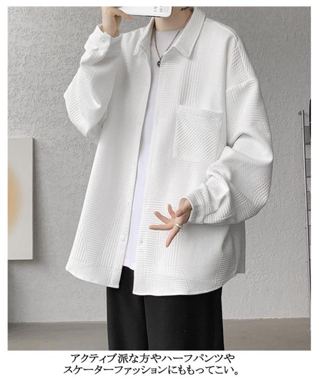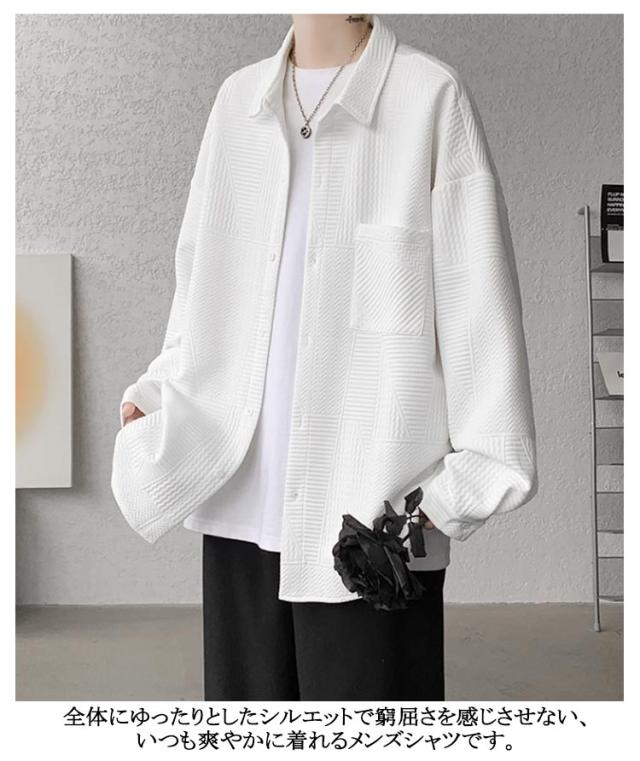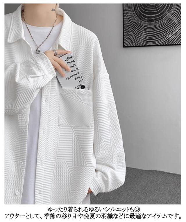 カジュアルシャツ ジャガード 長袖 ビッグシャツ ドロップショルダー 長袖シャツ メンズ ビッグシルエット エンボス シャツ 胸ポケット シャツジャケット ゆったり カジュアル 古着 ストリート グレー ホワイト カジュアルシャツ ブラック