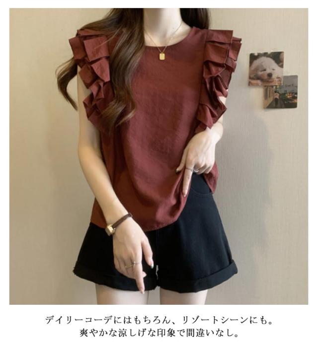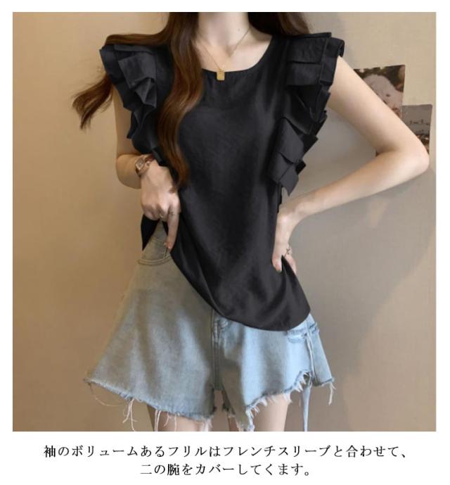 フリルブラウス ダブルフリル フレンチスリーブ シャツブラウス ブラウス フリルブラウス フリル ギャザー レディース カットソー 袖なし Tシャツ ノースリーブシャツ 韓国ファッション 二の腕カバー 大人 可愛い