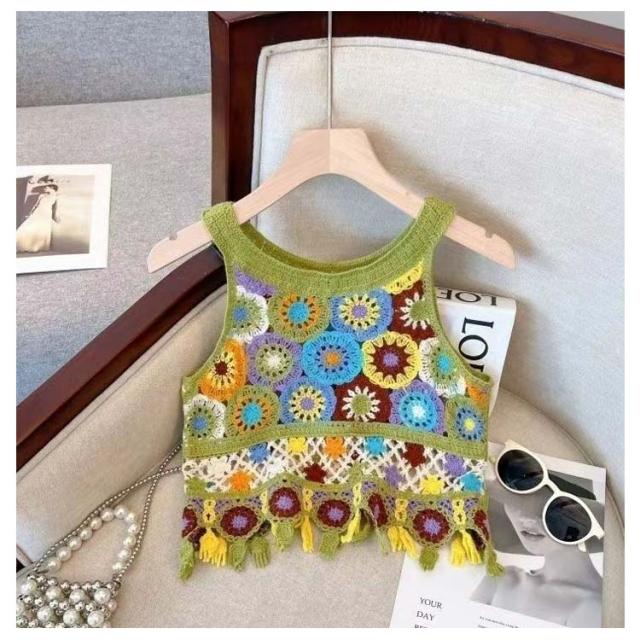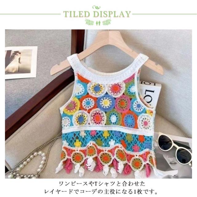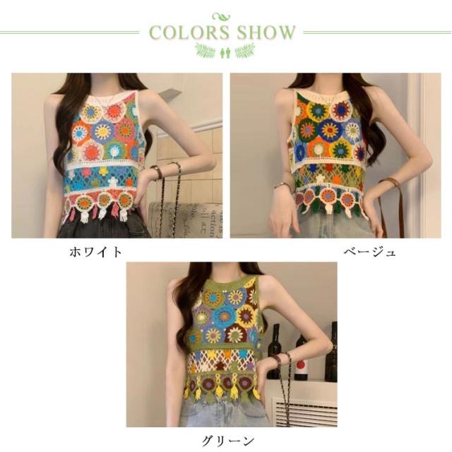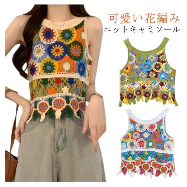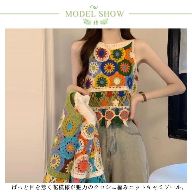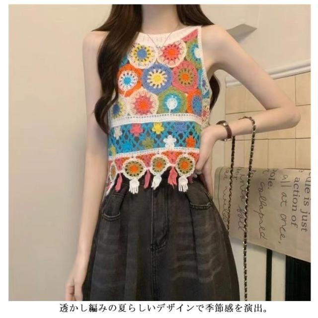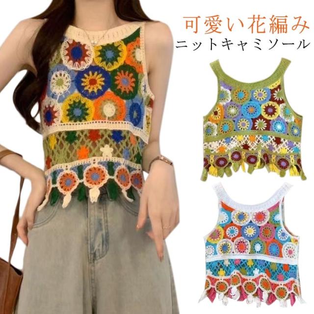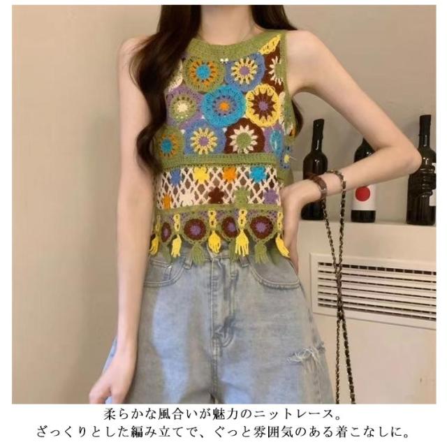 クロシェ レディース ベスト トップス ニット 可愛い花編み 総柄 プルオーバー サマーニット キャミソール 春夏 透かし編み 花柄 ノースリーブ ショート丈 キャミソール ニットベスト レトロ おしゃれ 大人 可愛い カジュアル