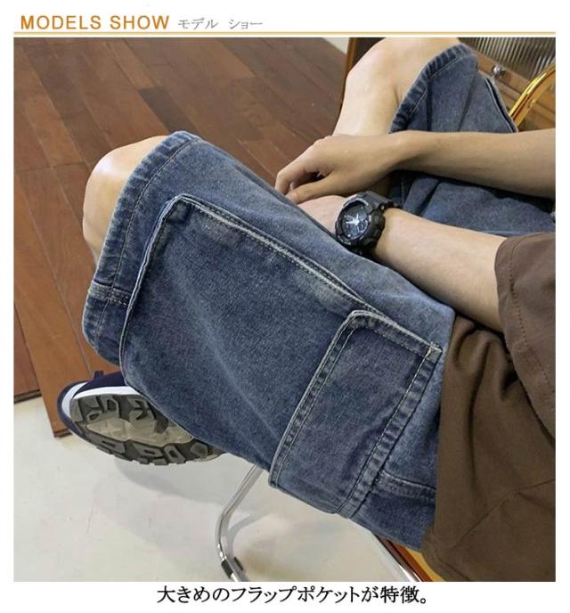 | カーゴデザインのデニムショートパンツ 大きめのフラップポケットが特徴 シンプルにTシャツを合わせだけのカジュアルコーデでも、 雰囲気のある旬な表情になります! | |