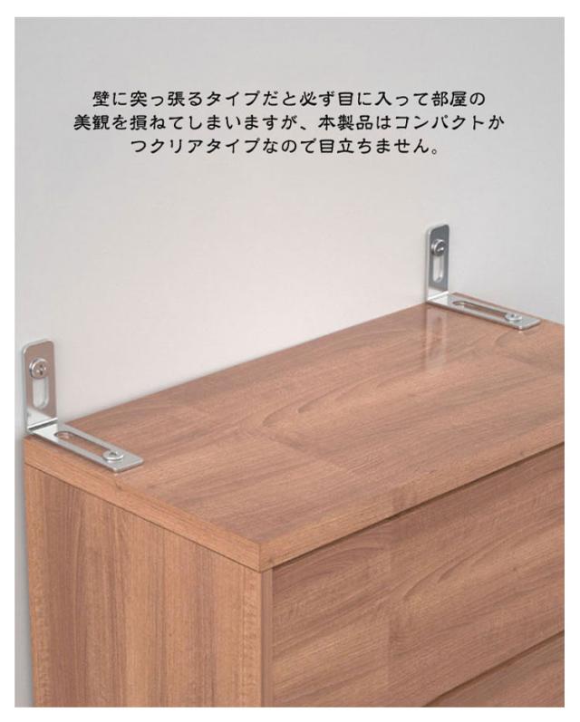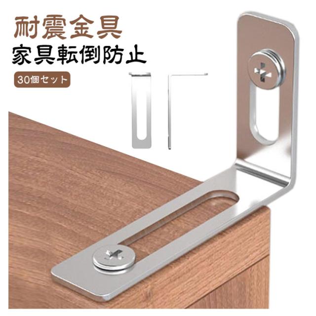 | 【30個セット】【家具転倒防止】【耐震金具】 家具の転倒防止に使えるL字型耐震金具。 ナットでL型金具を締め切らず固定しないことによって振動を逃がして家具に直接伝わらないよう吸収する仕組みです。 壁に突っ張るタイプだと必ず目に入って部屋の美観を損ねてしまいますが、本製品はコンパクトかつクリアタイプなので目立ちません。 背の高い家具の天面に設置すれば死角に設置することも可能です。 天面でも側面でも設置することができます。家具の大きさに合わせて複数設置することで耐震を強化することができます。 余計のデザインがなし、同類商品と比べて、大幅にスペースを節約しました。 取り付けた後に部屋はきれいなままで、必要な時だけにあなたとご家族の安全をしっかり守れます。 | |