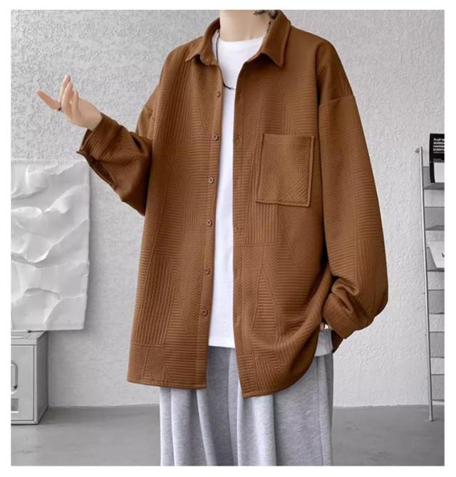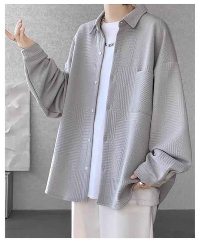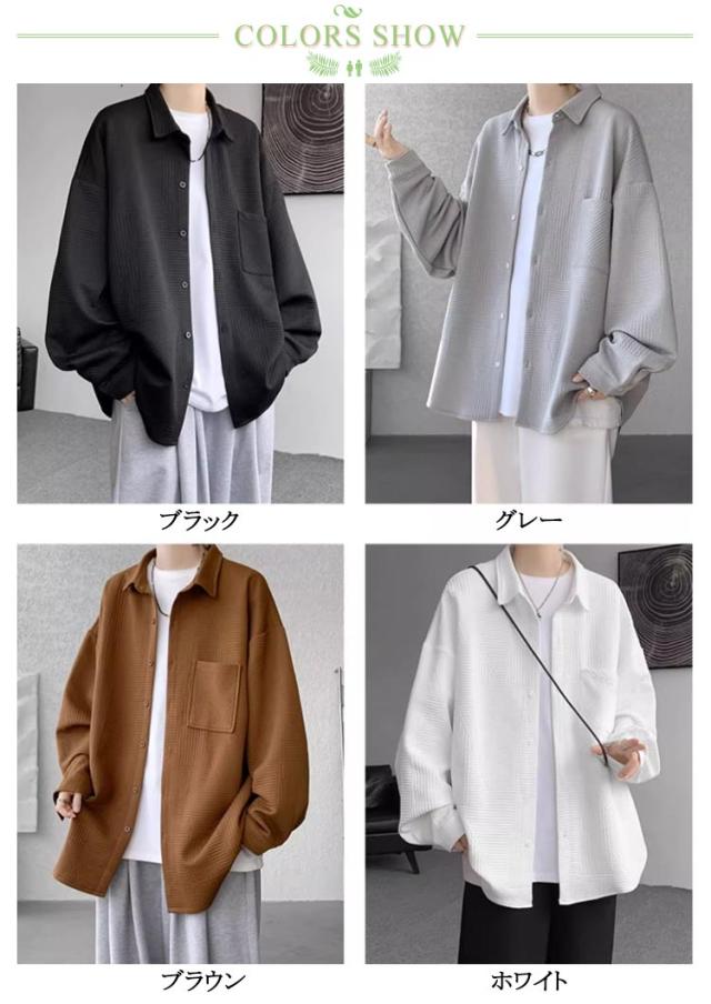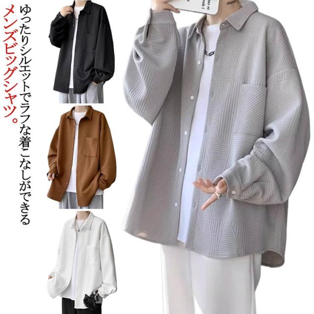 ビッグシルエット メンズ 長袖 カジュアルシャツ シャツジャケット エンボス ドロップショルダー ジャガード ビッグシャツ 長袖シャツ 胸ポケット カジュアル ゆったり ストリート 古着 シャツ 送料無料 ホワイト グレー ブラック
