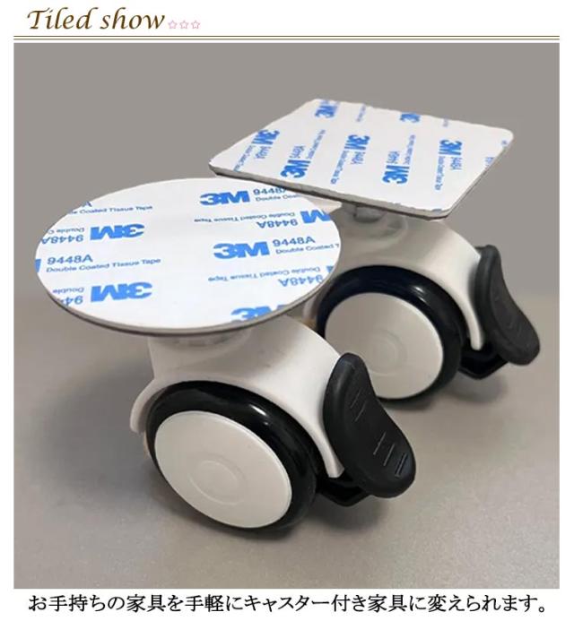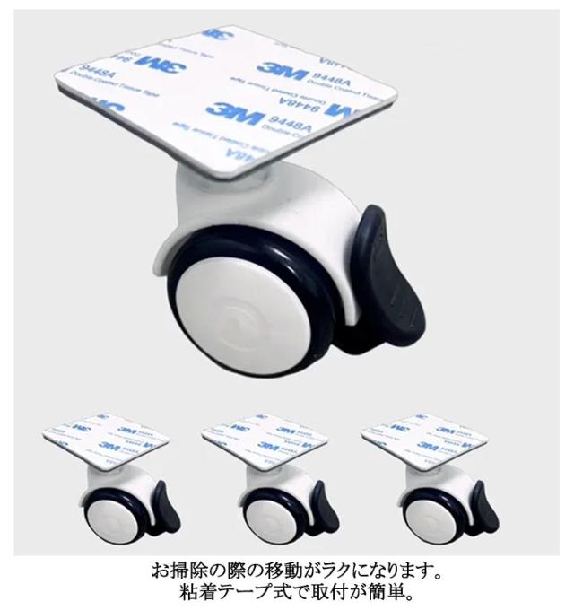 | ストッパー付き!貼るだけキャスター4個セット お手持ちの家具を手軽にキャスター付き家具に変えられます。 付属の強力両面テープで貼るだけでキャスターが付けられます。 お持ちの家具、ソファ、カラーボックス、キャビネット、テーブルなどを手軽にキャスター付き家具に変えられます。 お掃除の際の移動がラクになります。 粘着テープ式で取付が簡単。 ストッパーは家具が勝手に動くことが無く便利で安心です。 | |