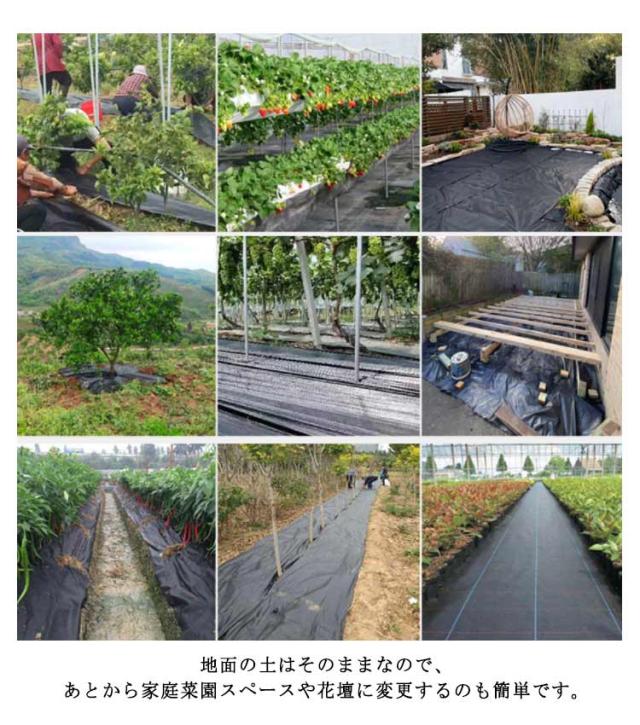 | 薬を使わずに雑草防止シート。 0.4*200m 0.5*200m 0.6*200m 日光を遮断し雑草の光合成を抑える事で、 何度抜いても生えてくる雑草を枯れさせて再発生を防ぎます。 地面を雑草が生えにくいコンクリートで固めるのには、 かなりの費用がかかりますが防草シートならとっても経済的で手軽。 地面の土はそのままなので、あとから家庭菜園スペースや花壇に変更するのも簡単です。 除草剤や草刈り機より手軽でお子様やペットをがいる家庭でも◎ | |