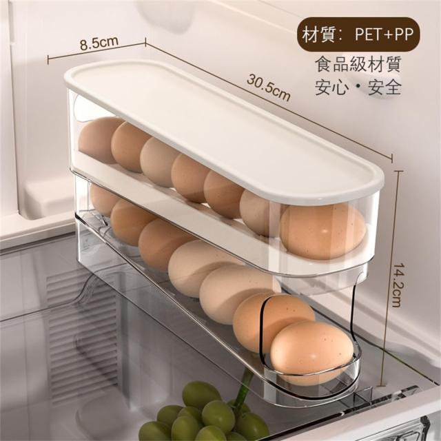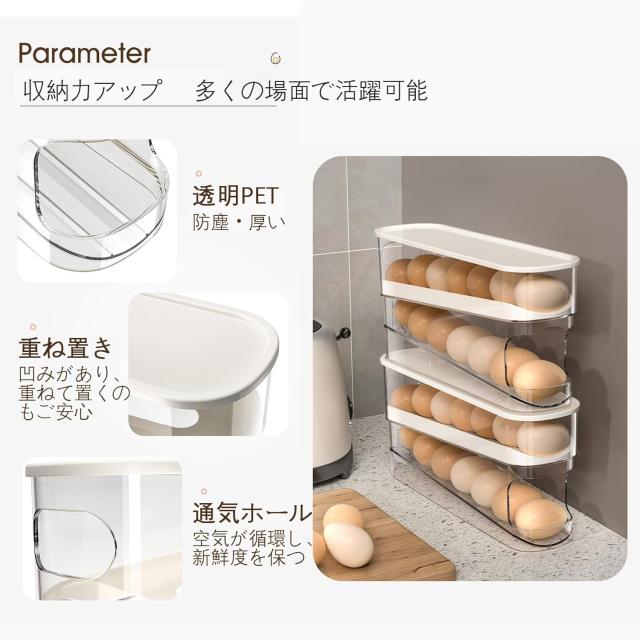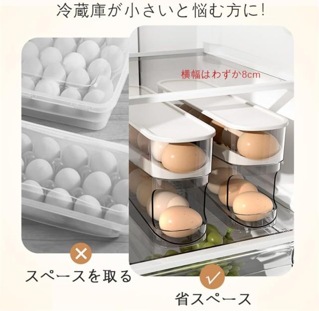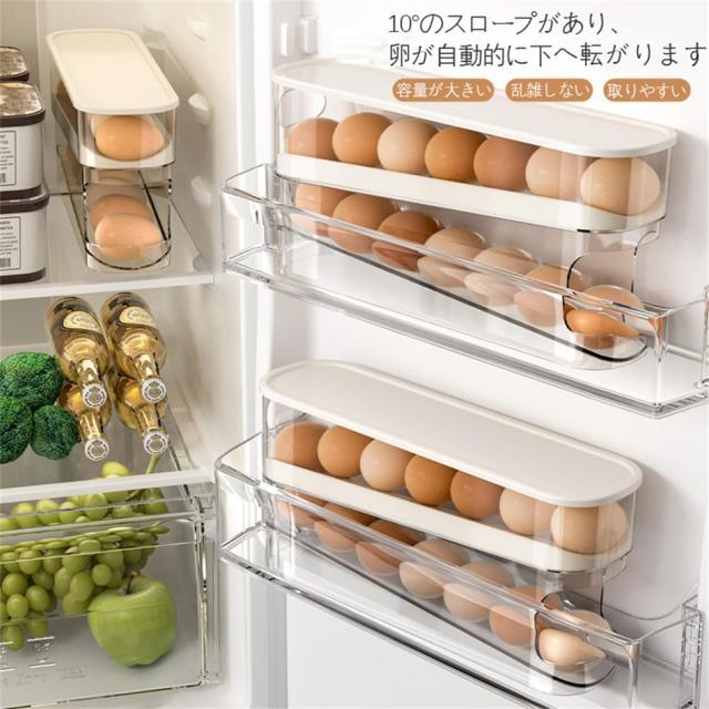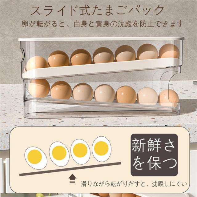 卵入れ 卵収納ボックス スライド式 自動ローリング 2段 卵ケース 冷蔵庫用 卵 オーガナイザー たまご 収納ケース ボックス エッグホルダー 取り出し便利 たまご収納 再利用可能 スペース節約 フタ付き たまご収納棚 重ね置き