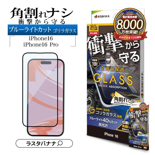 【送料無料】iPhone16 16 Pro iPhone15 ガラスフィルム 全面保護 ブルーライトカット 高光沢 角割れしない 衝撃吸収 ゴリラガラス採用 薄型 0.2mm 硬度10H アイフォン ラスタバナナ SGSA4305IP461 SGSA4385IP461P