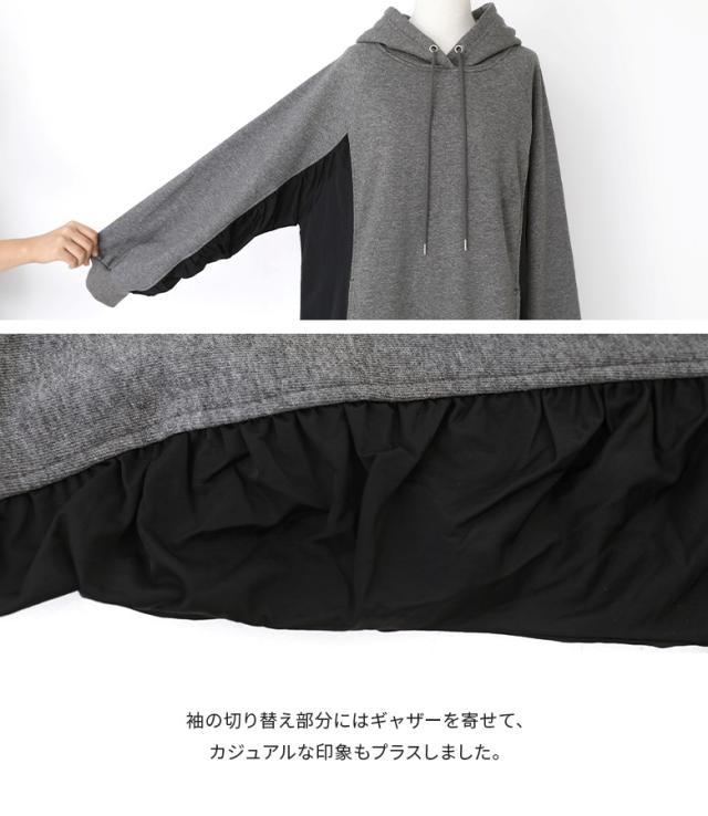 ■デザイン 裏毛素材とナイロン素材の異素材を組み合わせた、配色デザインスウェットワンピース。袖の切り替え部分にはギャザーを寄せて女性らしい柔らかな印象もプラスしました。 ■コーディネート 1枚でコーデが完成する、デイリー使いに嬉しいワンピース。フードの紐をリボン結びにして、さり気ないアレンジもできます。 ■素材 身生地には通気性の良いコットン混の裏毛素材を使用。通気性が良く柔らかな肌触りの生地感です。シャカシャカとしたナイロン素材を組み合わせた、異素材使いが特徴的な一枚。 |