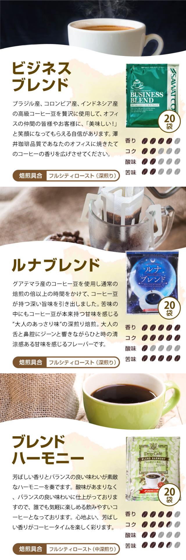 | 内容量 | ・ビジネスブレンド 7g×20袋 ・ルナブレンド 8g×20袋 ・ブレンドハーモニー 8g×20袋 |