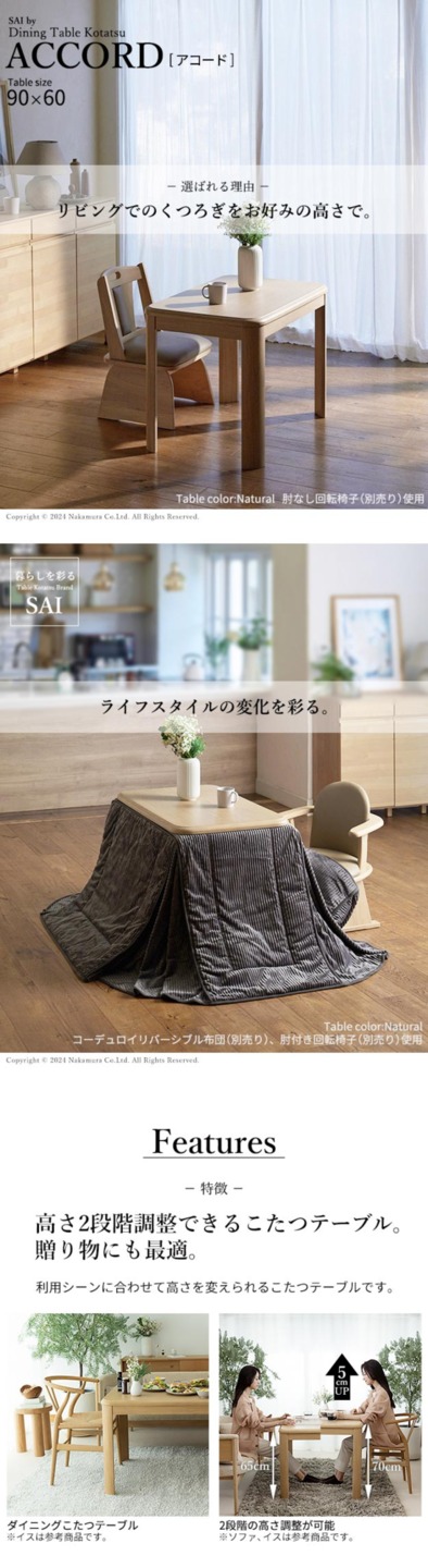 ダイニングこたつ アコード 90x60cm パワフルヒーター 高さ調節機能付き SAI 彩 長方形 ダイニングテーブル リビング コタツ 炬燵 本体のみ ハイタイプ ファン付き 省エネ 継ぎ脚 ナチュラル ベージュ ブラウン 木目 天然木 テレワーク mu-g0100066 店舗 カフェ ラウンジ ロ