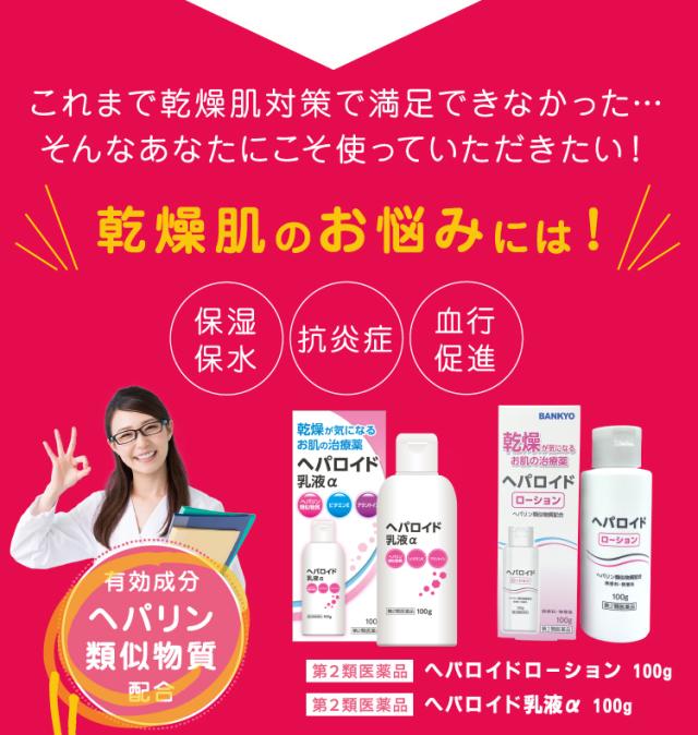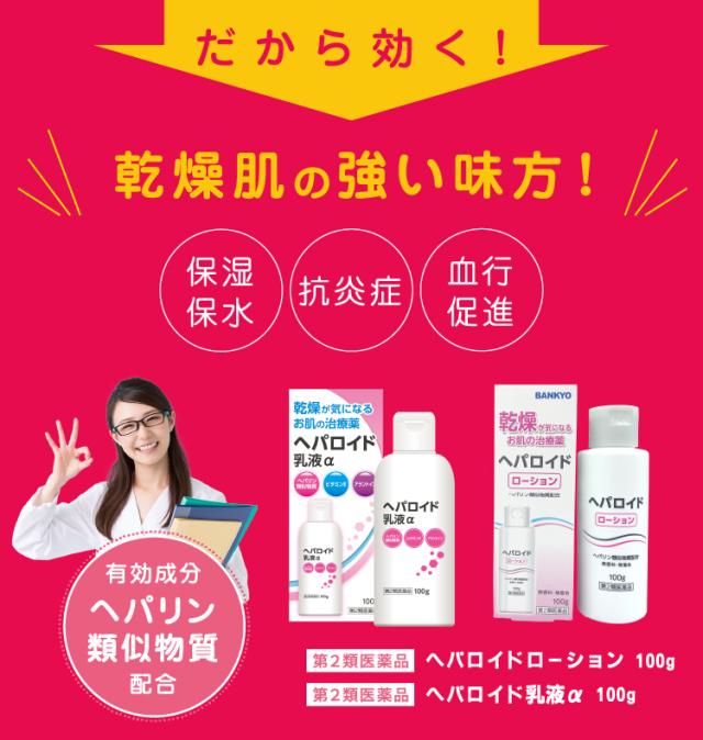 乾燥肌・肌荒れにお悩みの方のために開発した医薬品です。医療用医薬品でも使用されているヘパリン類似物質を0.3%配合しています。