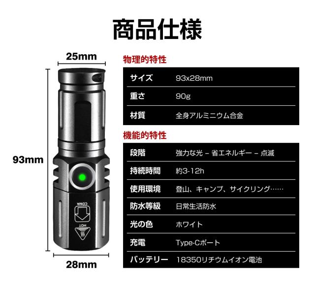 このLED懐中電灯は9.3cmの長さで、頭の直径は2.8cm、非常にコンパクトで、重さはわずか90gです。 便利なポケットクリップ付き、ポケット、シャツ、どんなポケットにもポケットが付いています。