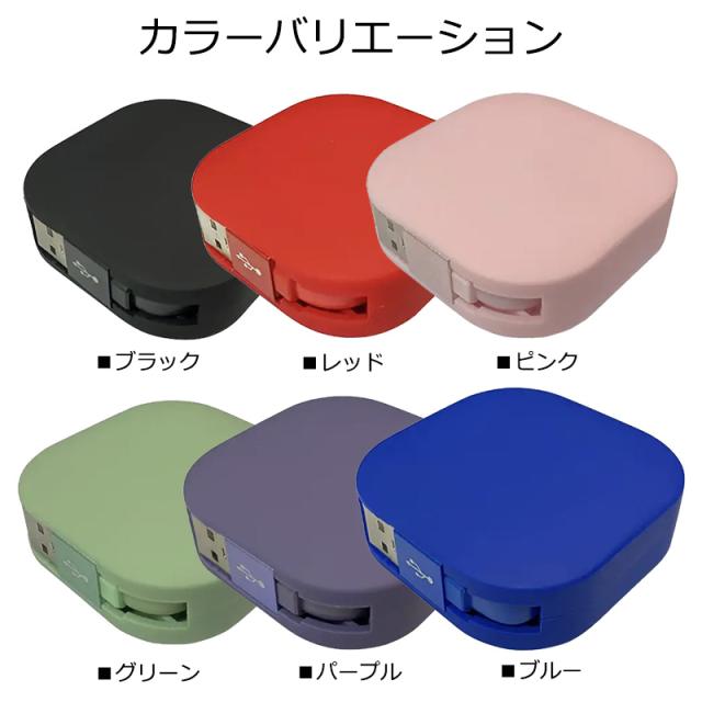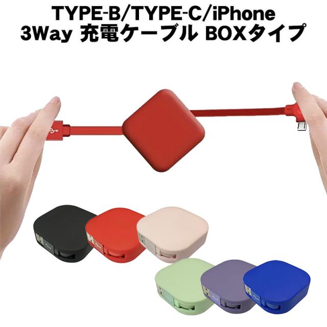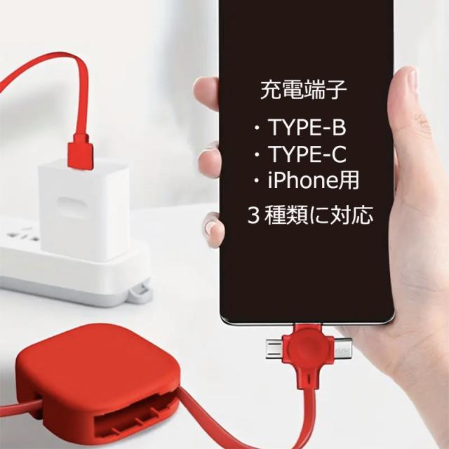 | 充電ケーブル 3way 急速充電 10W 3A 巻き取り TYPE-B TYPE-C iPhone用 1本3役 スタンド機能付き レッド グリーン ブルー ブラック パープル ピンク 全6色 |