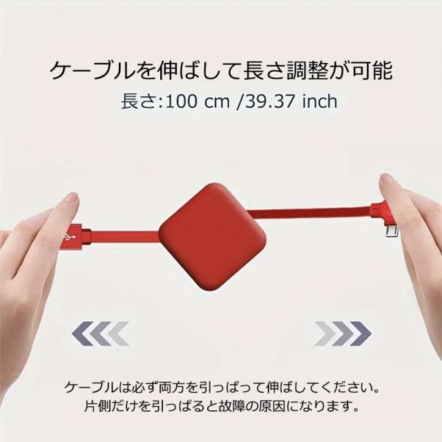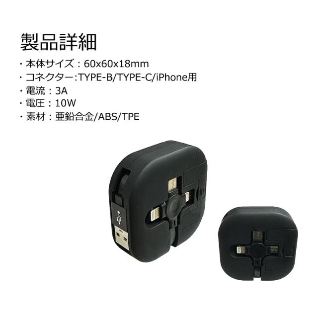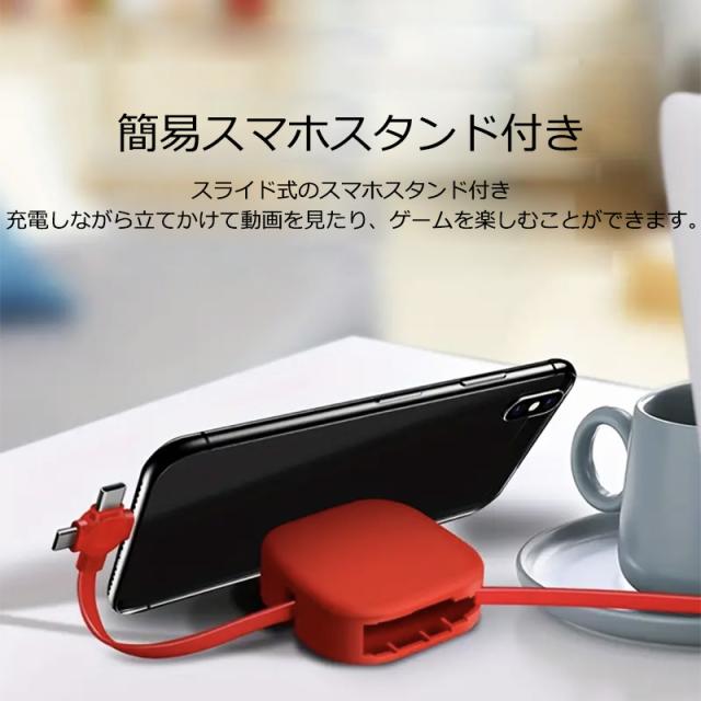 充電ケーブル 3way 急速充電 10W 3A 巻き取り TYPE-B TYPE-C iPhone用 1本3役 スタンド機能付き レッド グリーン ブルー ブラック パープル ピンク 全6色