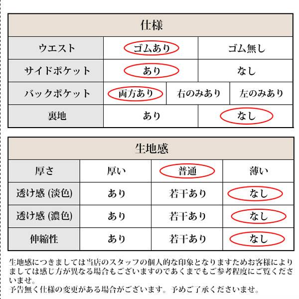 【Mサイズ】ウエスト72/ヒップ122/着丈98/裾幅35(cm) 【Lサイズ】ウエスト75/ヒップ126/着丈100/裾幅35.5(cm) 【XLサイズ】ウエスト78/ヒップ130/着丈102/裾幅36(cm) 【2XLサイズ】ウエスト81/ヒップ134/着丈104/裾幅36.5(cm) 【3XLサイズ】ウエスト84/ヒップ138/着丈106/裾幅37(cm) |