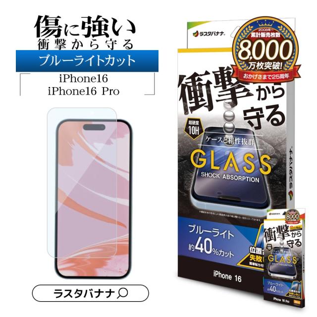 iPhone16 16 Pro iPhone15 ガラスフィルム 平面保護 ブルーライトカット 高光沢 衝撃吸収 ゴリラガラス 硬度10H ガイド枠付 ラスタバナナ
