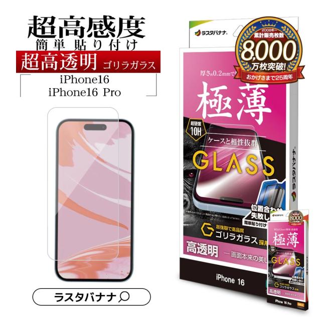 【送料無料】iPhone16 16 Pro iPhone15 ガラスフィルム 平面保護 高光沢 高透明 クリア 高感度 0.2mm ゴリラガラス採用 硬度10H 簡単貼り付け アイフォン ラスタバナナ GST4323IP461 GST4399IP461P