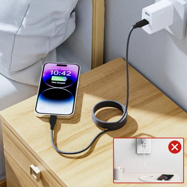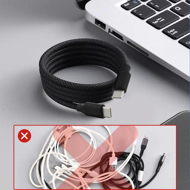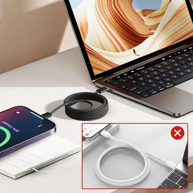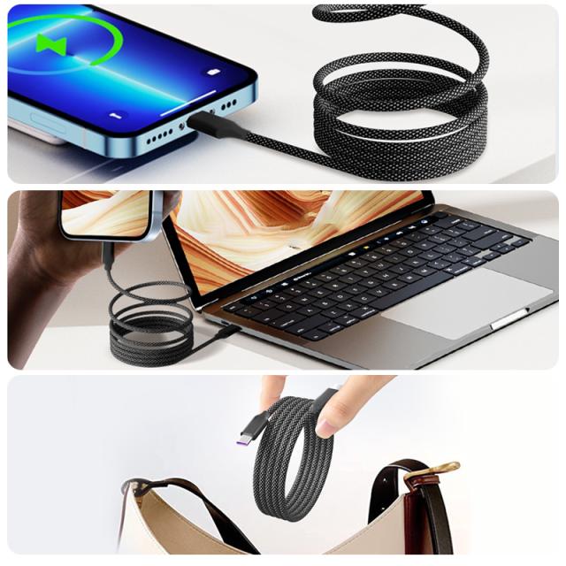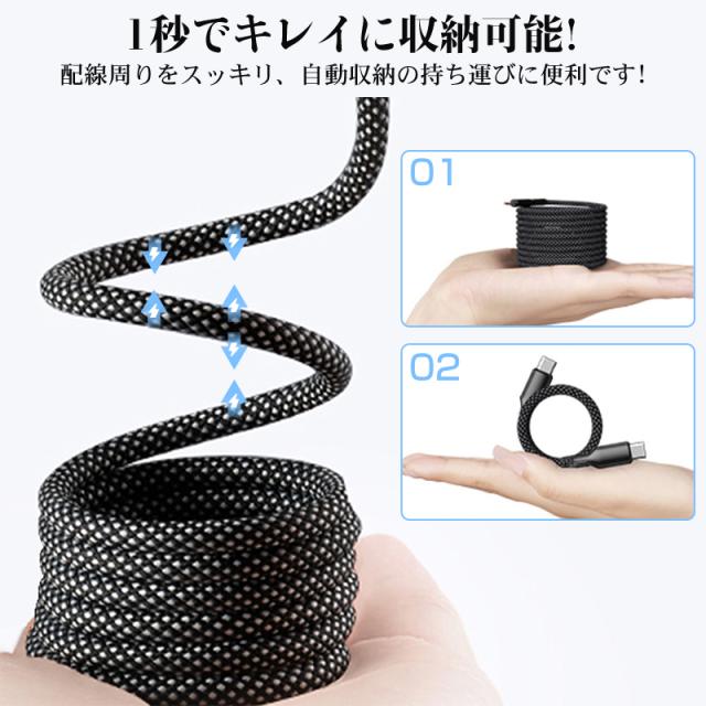 この充電ケーブルは、マグネット式の収納機能を備えています。使用後に簡単に端末から取り外し、ケーブルが自動的にコンパクトに収納されるため、煩わしい絡み合いや持ち運び時の不便を解消します。いつでもどこでもスムーズに収納持ち運びが可能です。