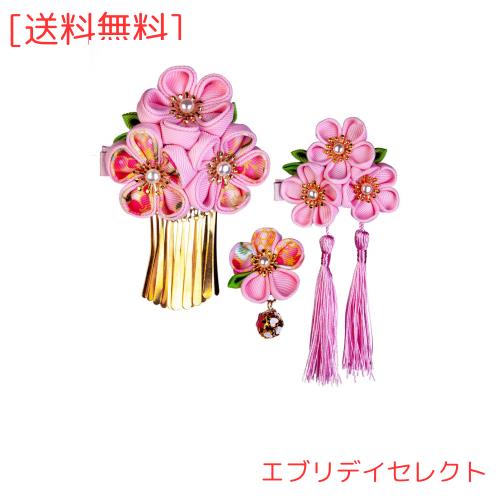 [JZOON] 髪飾り3点セット 成人式 七五三 浴衣 袴 着物 振袖 和装 つまみ細工 花 卒業式 結婚式 鈴付き 手作り ピンクA 5色全15選