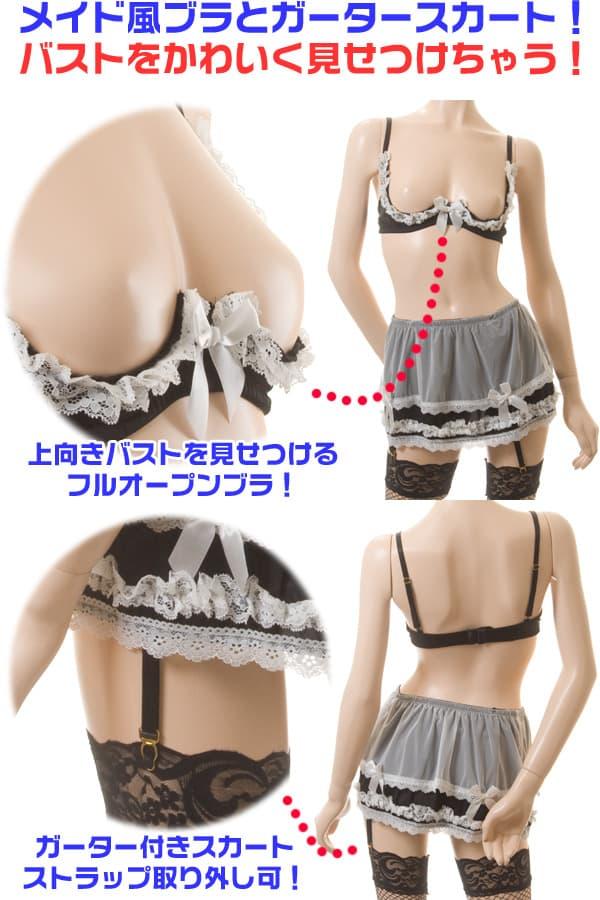 メイド ワイヤー入 オープン バスト ブラ トップレス シェルフ ガーター ベルト スカート セット ストッキング別売 セクシー ランジェリー 下着 上下 ブラジャー 女性 レディース 勝負 過激 グッズ おもちゃ エロ エッチ エロい エッチな sexy