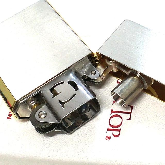 サテンシルバーの本体のサイドにゴールドのラインを施したスタイリッシュなギアトップライター。