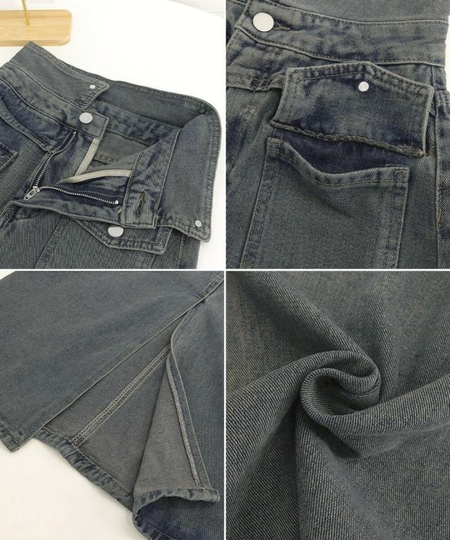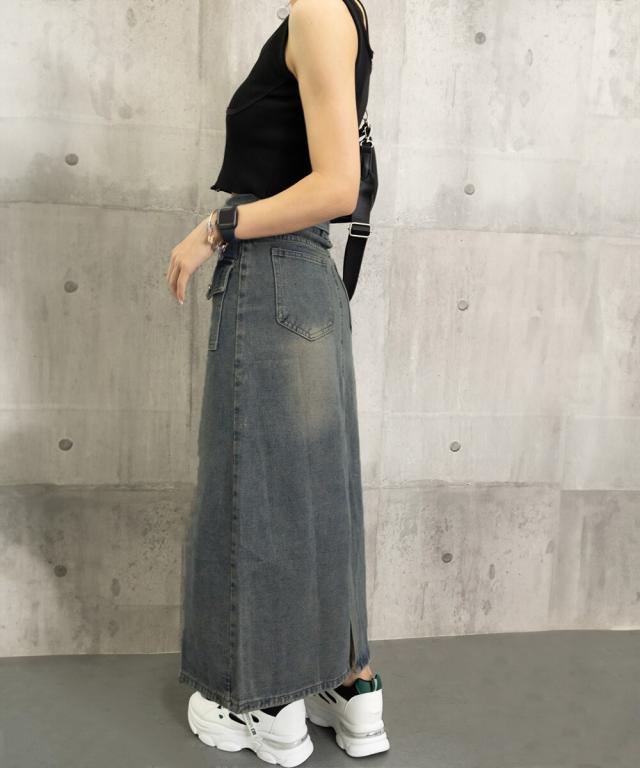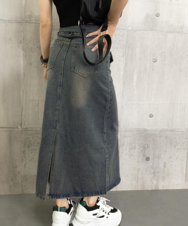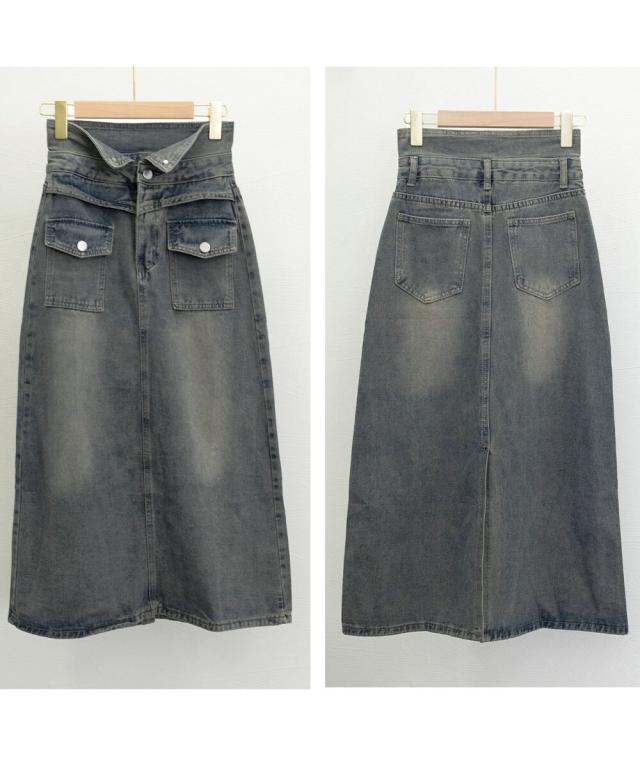 ウエストの折り返しデザインがユニークなマキシ丈デニムスカート