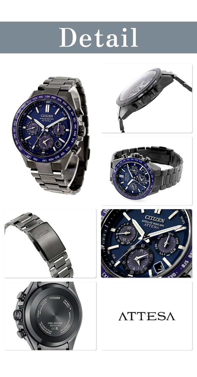 | 仕様 | 日常生活用強化防水(10気圧) 平均月差±5秒(非受信時) デイ&デイト表示 1/20秒クロノグラフ(24時間計) アラーム パーペチュアルカレンダー 衛星電波受信機能 位置情報取得機能 ワールドタイム機能(39時差) サマータイム機能 デュアルタイム機能 ホーム/ローカルタイム切替機能 衝撃検知機能 針自動補正機能 ライトレベル インディケーター 充電量表示機能 充電警告機能 過充電防止機能 過放電検出機能 充電禁止温度検出機能 パワーセーブ機能 駆動期間:フル充電時約5年可動(パワーセーブ作動時) 耐メタル 耐磁1種 夜光(針+インデックス) フィットアジャスター 日本製 |