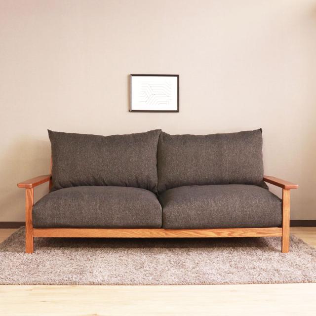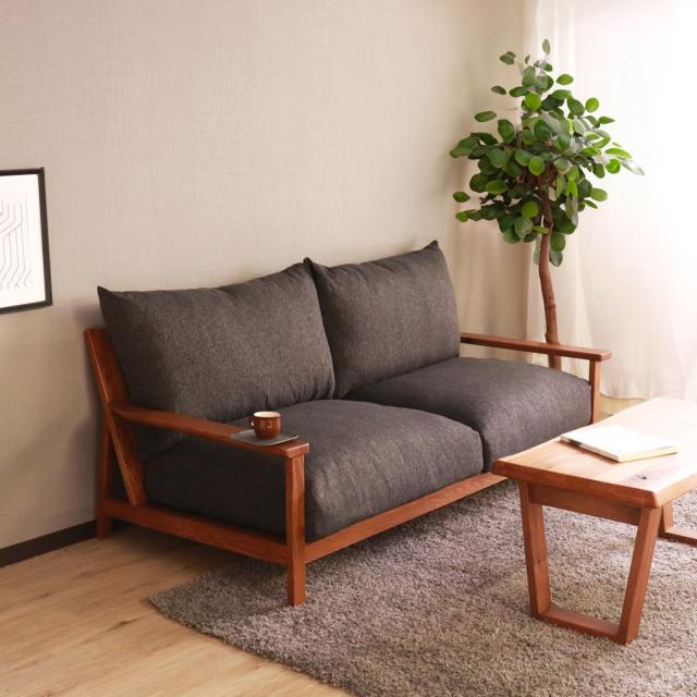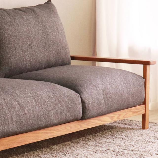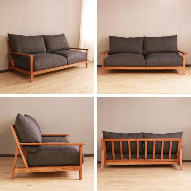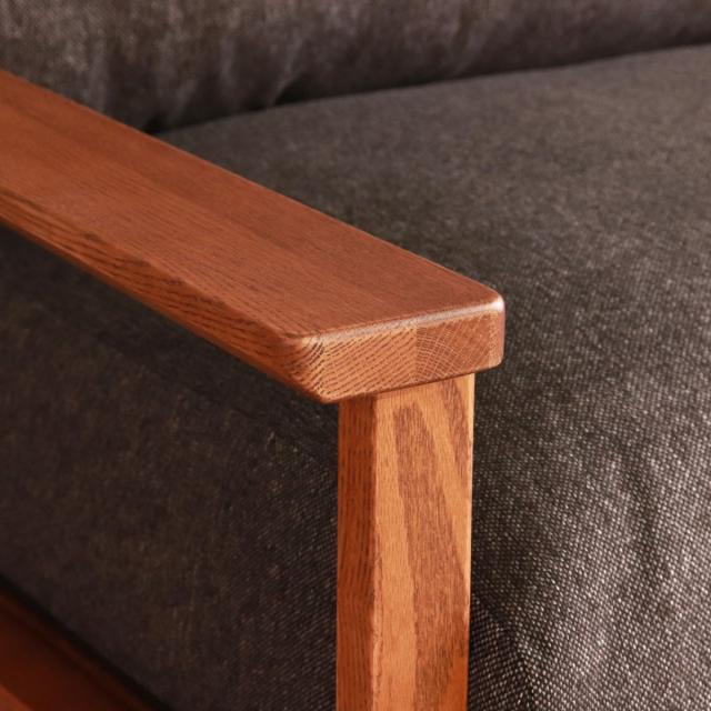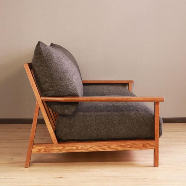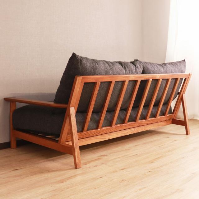 フレームにレッドオークの無垢材を使用した3人掛けのソファ
